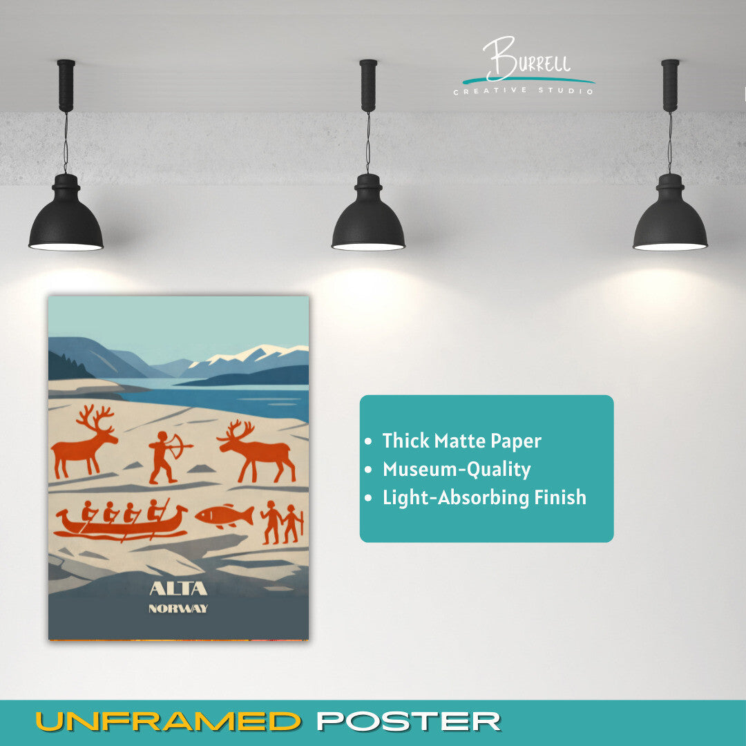 Step back thousands of years and connect with humanity’s earliest stories through this striking Alta Rock Carvings wall art poster. Located along the fjords of Northern Norway, these UNESCO-listed carvings capture scenes of ancient life etched into stone—reindeer hunts, boats, rituals, and the rhythms of survival under the Arctic sky.