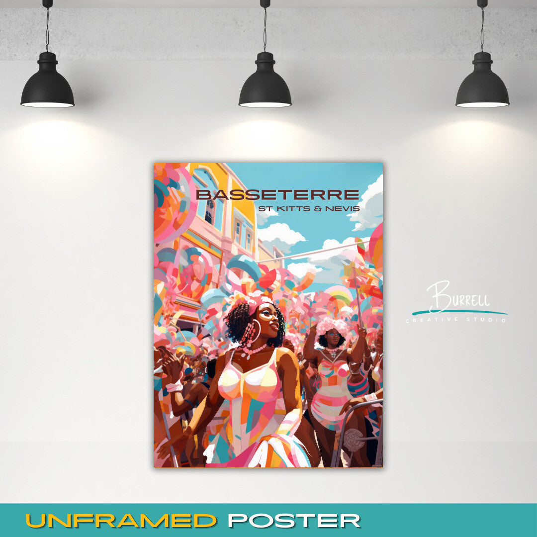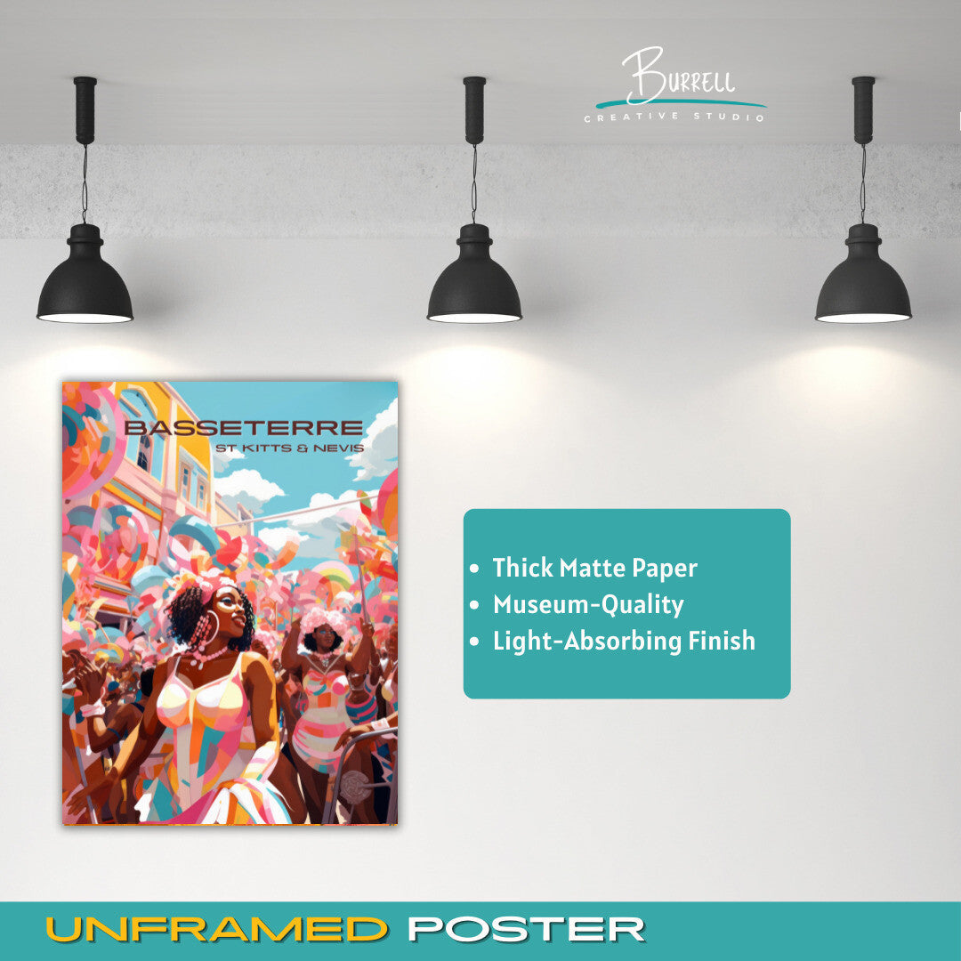 Immerse yourself in the lively scenes of costumed performers, rhythmic music, and the infectious energy that defines the carnival. The vivid details and lively composition of this poster transport you to the heart of Basseterre's festive atmosphere, where locals and visitors come together to revel in the island's cultural heritage.