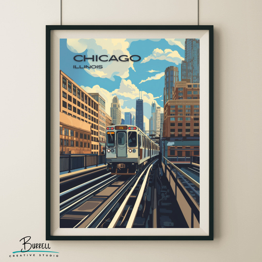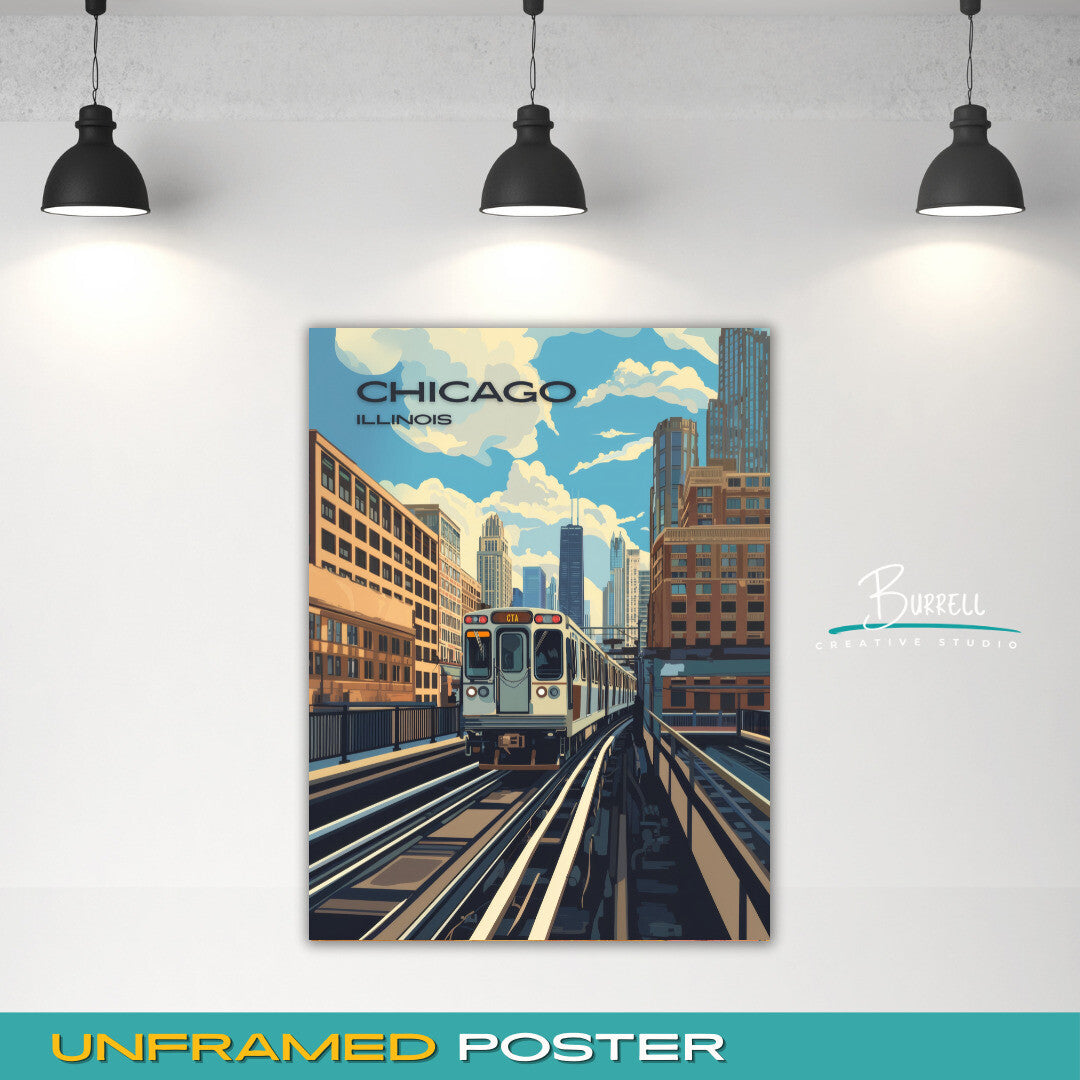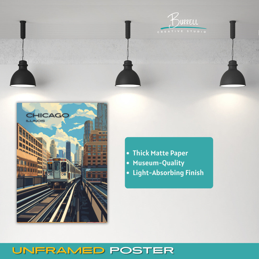 Immerse yourself in the heart of Chicago's vibrant urban life with this stunning wall art poster featuring the Chicago CTA (Chicago Transit Authority) in Lincoln Park. The iconic L train, with its signature elevated tracks, weaves its way through one of the city's most beloved neighborhoods, perfectly capturing the dynamic blend of nature and cityscape that defines Lincoln Park.