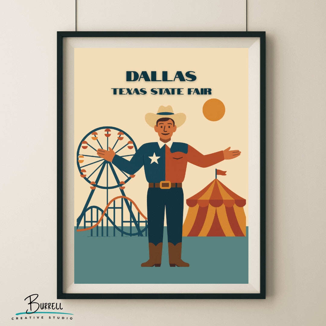 Step into the joy, color, and excitement of Texas’s most beloved tradition with this lively Dallas State Fair Attractions wall art poster. From the iconic Big Tex to thrilling rides, nostalgic games, and mouthwatering fair food, this piece captures the spirit of celebration that fills the air every fall in Fair Park.