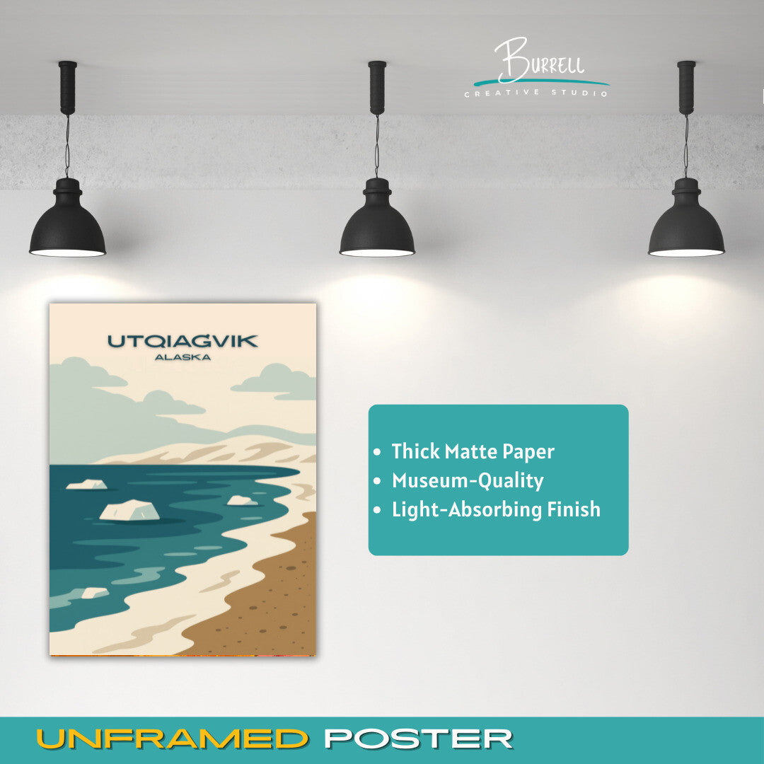 Bathed in the soft glow of polar twilight or the faint shimmer of the aurora, Utqiaġvik in winter is a place of powerful contrasts—harsh yet peaceful, remote yet full of life. This poster evokes the raw elegance of a land shaped by wind, ice, and resilience.
