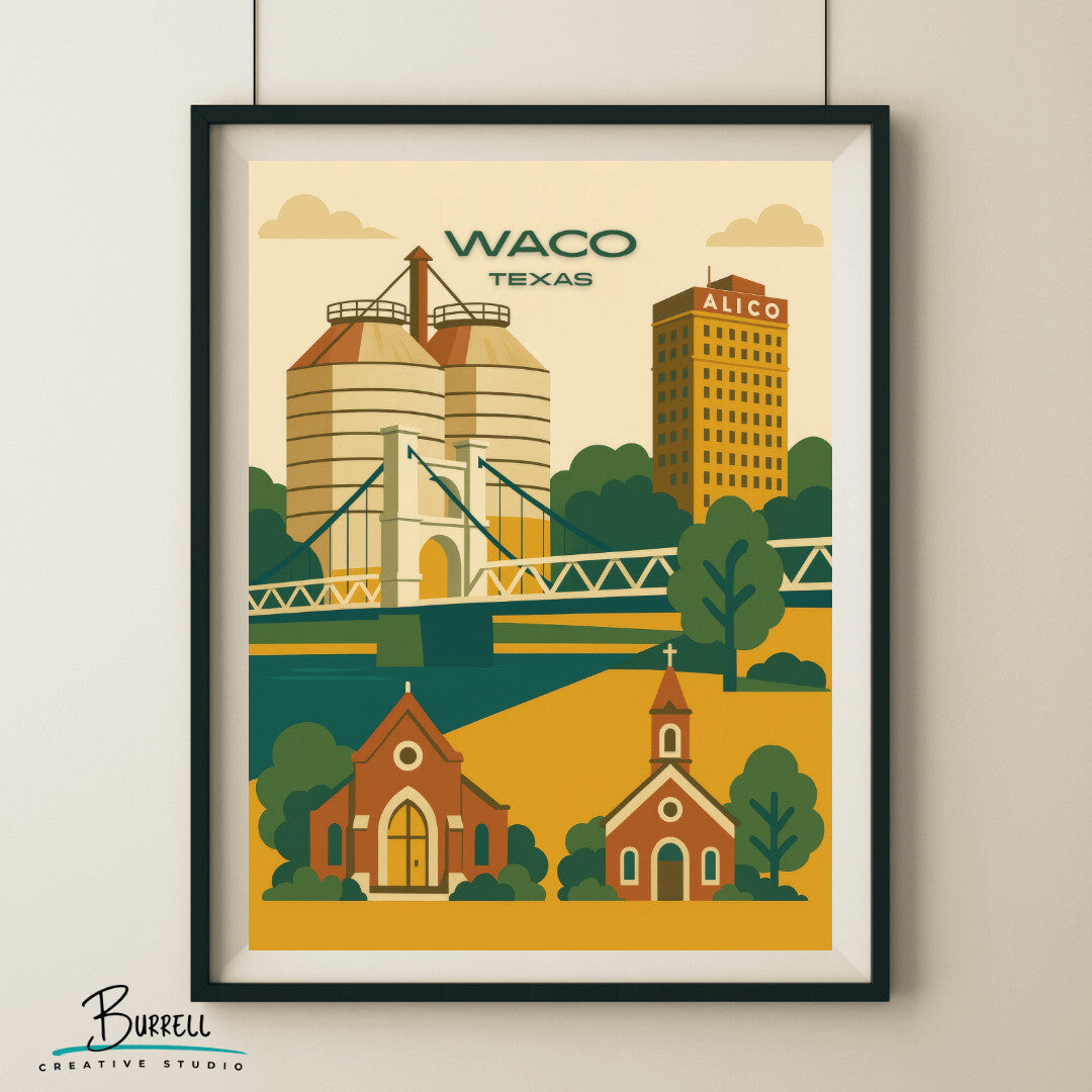 Whether it's the rustic appeal of Magnolia Market, the architectural grace of the Suspension Bridge, or the natural beauty along the Brazos, Waco offers an unexpected blend of inspiration and charm. This poster is perfect for Waco natives, Baylor alumni, or anyone who has fallen in love with this hidden gem of Central Texas.